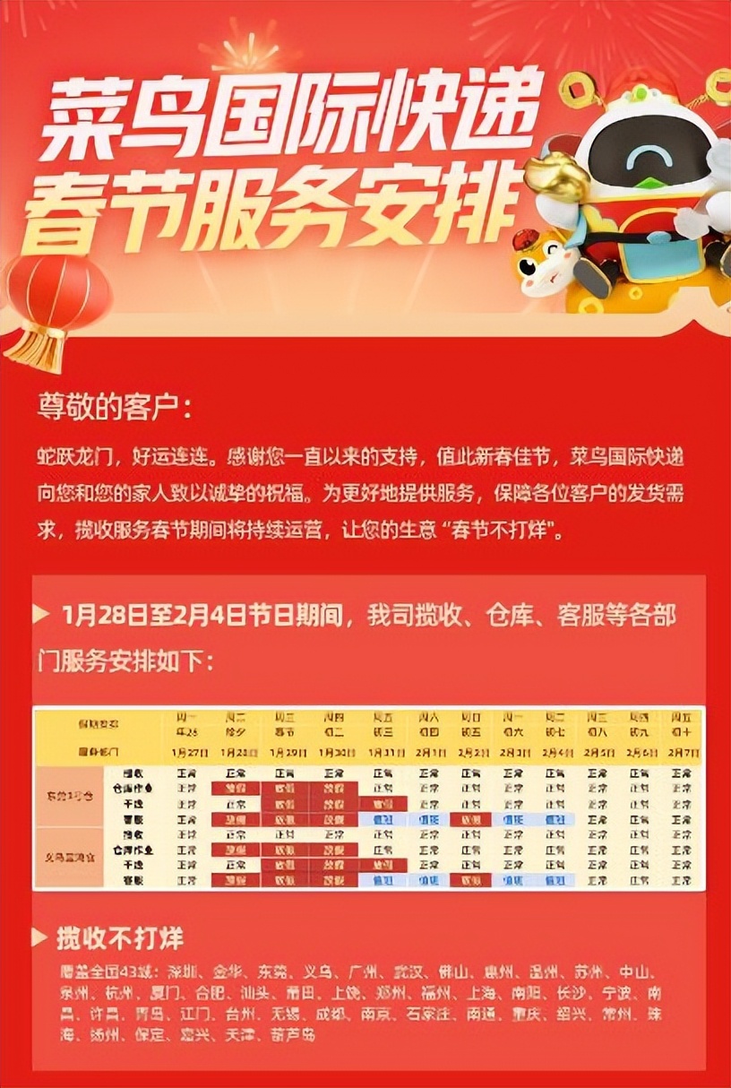 隨着蛇年春節的不斷臨近,菜鳥國際快遞跨境物流保障再加碼,推出43城上門攬收服務“春節不打烊”,包括深圳、廣州、義烏、杭州、福州、廈門等跨境電商聚集地,以及佛山、許昌、鄭州、寧波、葫蘆島等跨境產業帶,在攬收區域範圍內,菜鳥國際快遞提供1件起免費上門攬收服務。