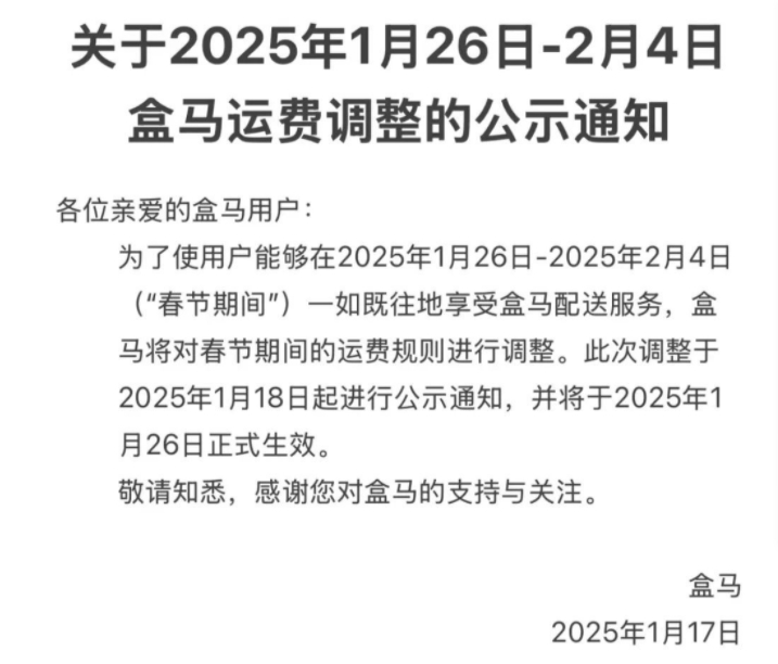 盒馬App發佈的春節運費規則為,2025年1月26日0點至2月4日24點(“春節期間”)所有用户(含X會員)通過盒馬APP或盒馬第三方小程序等線上渠道下單購買盒馬門店的商品,任意金額訂單均收取6元/單運費。