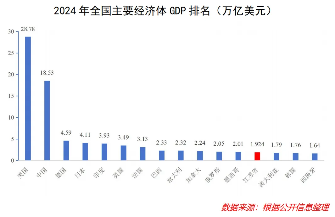 從上圖可以清晰地看到,2024年美國與中國高居世界各國經濟排行榜前兩位,德國、日本、印度、英國、法國、巴西等國家緊隨其後;俄羅斯、墨西哥、澳大利亞、韓國、西班牙分別位列全球第11~15名。**如果江蘇省有資格參與全球排名,那麼其2024年的GDP數值超過了澳大利亞、韓國和西班牙,直追墨西哥和俄羅斯,能夠排在全球第13位,**凌駕於世界180多個國家和地區之上,妥妥的富可敵國。