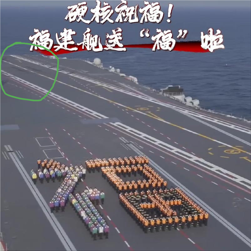 而從這次披露的視頻畫面來看,福建艦並不是在碼頭上排列巨大的“福”字的,