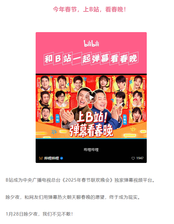 趕在農曆春節前,完成這一連串的安排,2025年的B站可能會異常精彩。期待這場由以年輕羣體為主的綜合視頻社區與春晚構成的合作碰撞出的別樣火花。