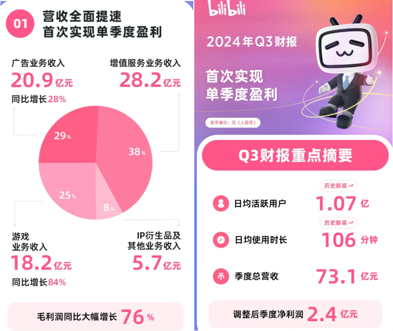 最新財報數據顯示,截至2024年前三季度,B站實現15%總收入增長。其中第三季度同比增速高達26%,當期實現總營收73.1億元。
