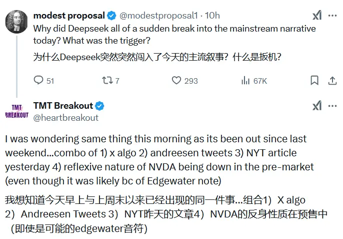 “DeepSeek R1的突然爆火(可能因其技術突破或市場關注)與英偉達股價下跌之間存在某種關聯。 X平台上的討論情緒和英偉達股價下跌共同影響了市場參與者的行為,尤其是投機性交易者,他們試圖通過做空英偉達股票來從中獲利。 這種關聯性在diffley/wigg等交易員或分析師開始公開討論之前就已經被一些自營交易員捕捉到。”