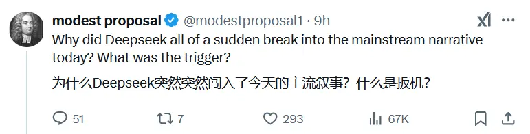 R1模型發佈一週之後,來自中國的神秘AI公司DeepSeek刷屏美國各大主流媒體和社交網站。以至於AI投資者“modest proposal”一臉問號地發推:
