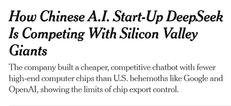 至於紐約時報對DeepSeek的報道,我們也看了下,對DeepSeek的成功,紐約時報是既羨慕又警惕: