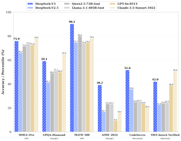 ▲Deepseek-V3與多個國內外大模型的測試數據對比。(圖源:“Deepseek”公眾號)