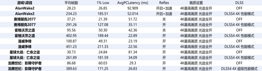 在幾款已經有DLSS 4支持的遊戲的測試數據裏,可以看出在4K最高畫質光追全開時,遊戲開啓DLSS 4多幀生成確實讓幀數提升了3到8倍不等,又因為超分提高了原生幀的基礎幀率,再加上Reflex技術,遊戲延遲也都更低了。