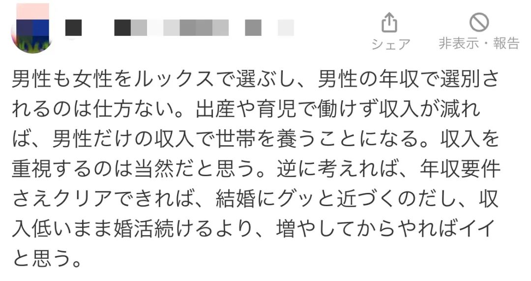 男性在選擇伴侶時也會看重女性的外貌,因此男性被以年收劃檔也是無可厚非的。如果女性因為生育和育兒而無法工作,導致收入減少,那麼家庭的經濟負擔就會落在男性的肩上。重視收入是理所當然的事情。換個角度想,只要能夠滿足年收的要求,就更接近結婚的目標了。與其在收入較低的情況下繼續婚戀活動,不如先提高自己的收入再考慮結婚,這樣更好。