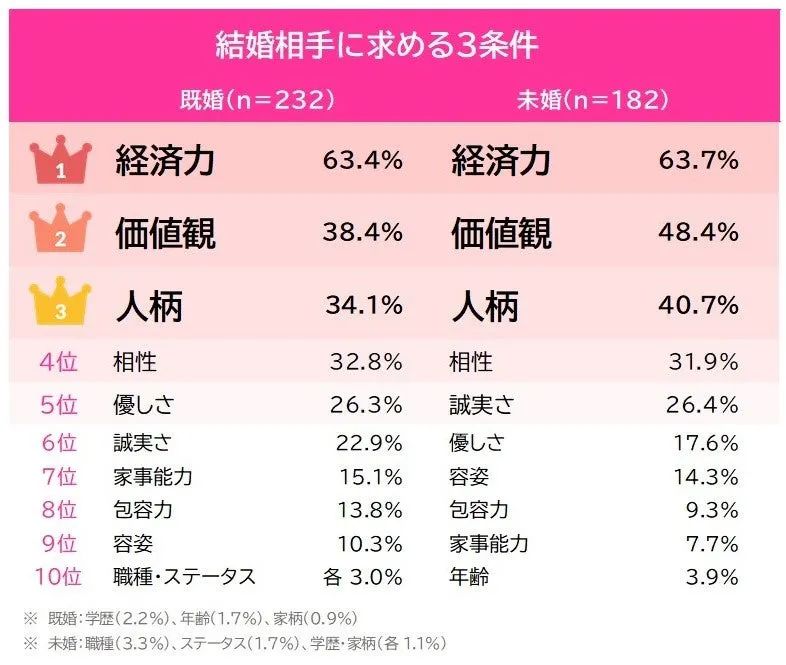 就算不同國度,不同文化,相親時對基礎條件的要求也不會有太大出入。鄰居日本國立社會保障·人口問題研究所,2023年公佈的關於結婚和生育的全國調查顯示,認為選擇結婚對象時應重視對方“經濟實力”的女性,比例為91.6%。
