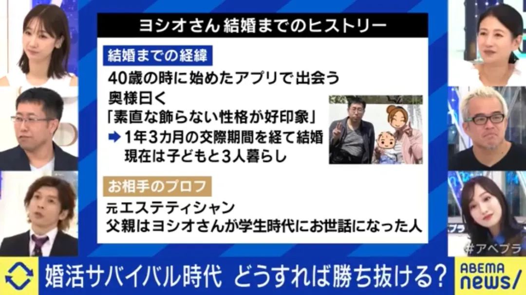 不過緣分有時候就是很奇妙,來的時候擋也擋不住。就在ヨシオ心灰意冷,打算把手裏的最後一個婚戀APP退會的時候,他遇見了現在的妻子,兩人在交往1年三個月後結婚,現在一家三口一同生活。