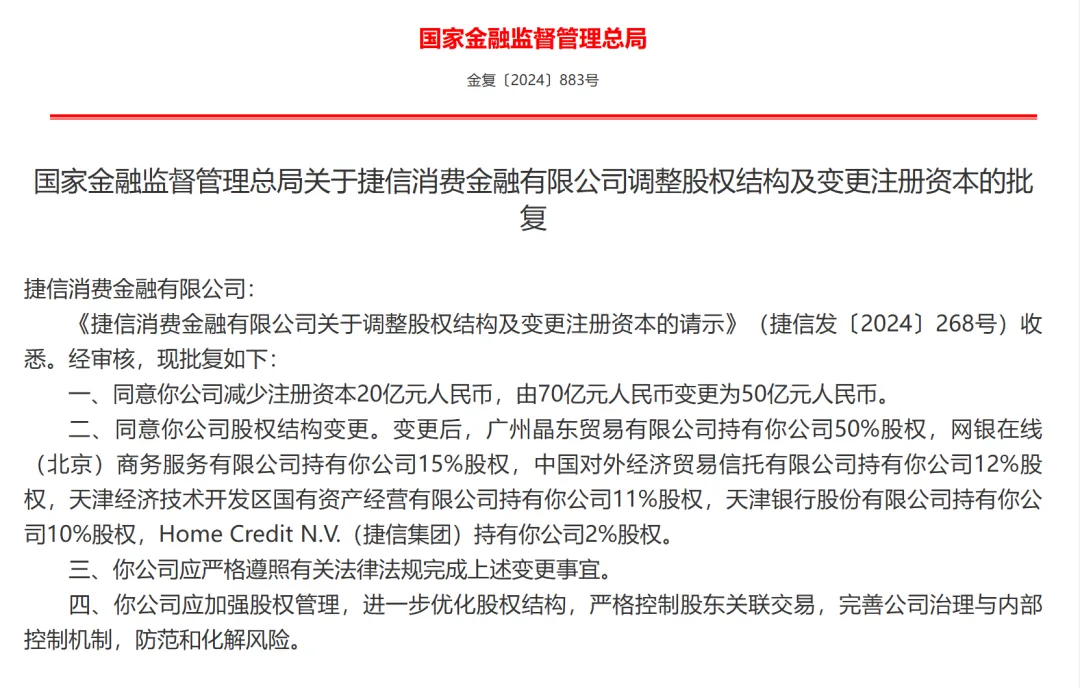 變更後,廣州晶東貿易有限公司持有捷信消費金融50%股權,網銀在線(北京)商務服務有限公司持有15%股權,中國對外經濟貿易信託有限公司持有12%股權,天津經濟技術開發區國有資產經營有限公司持有11%股權,天津銀行股份有限公司持有10%股權,Home Credit N.V.(捷信集團)持有2%股權。