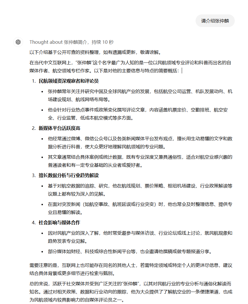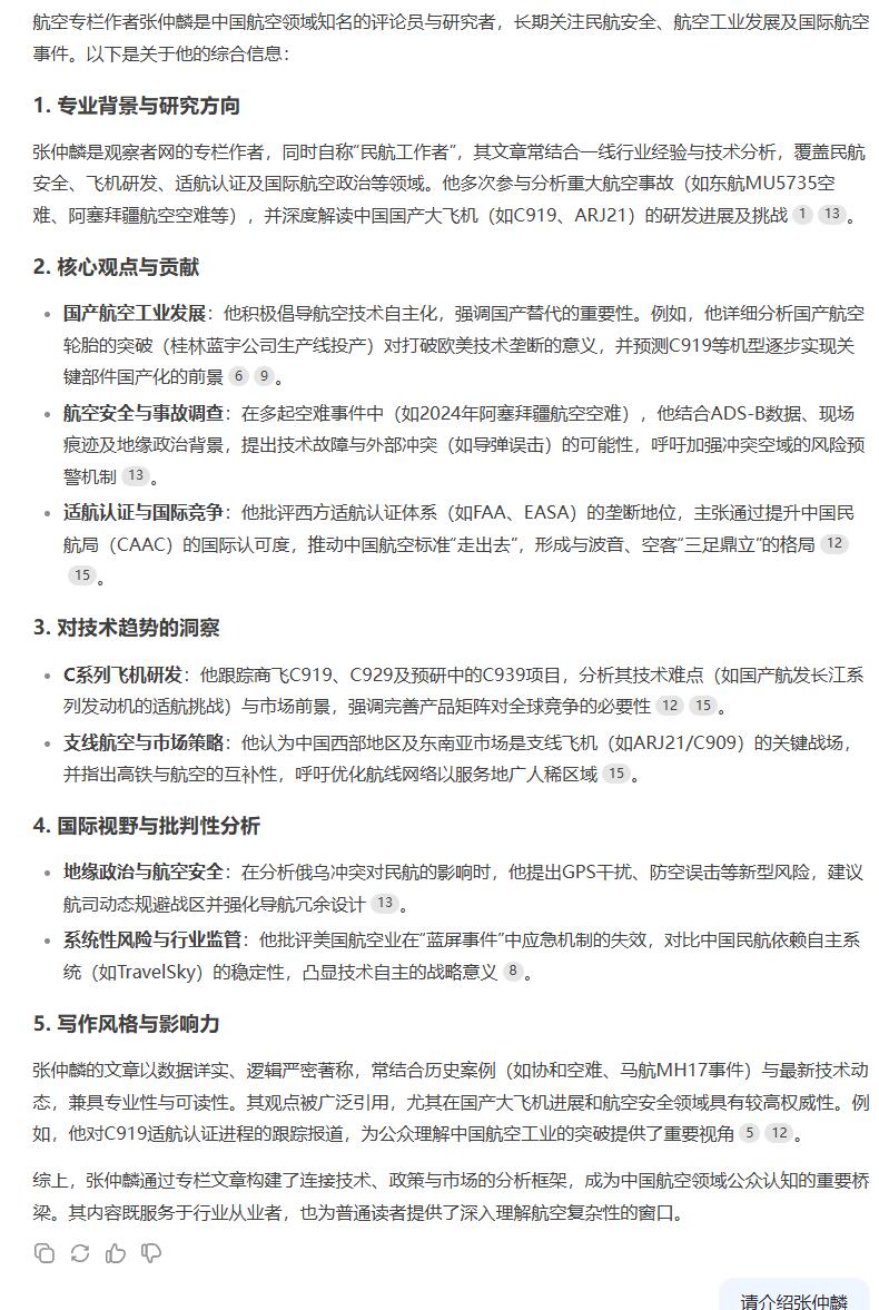 作為知名度並不高的人物並且存在重名的情況,會輸出什麼樣的結果讓我很好奇。當然為了避免重名導致的干擾,強調了是“航空專欄作者張仲麟”而輸出的結果給了我一個不小的驚喜。