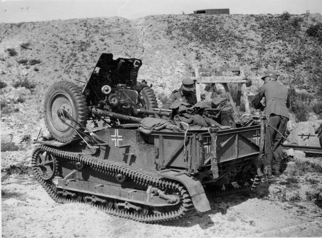 純粹由德國人完成的改裝主要採用了德制火炮,尤其是3.7 cm Pak。這些改裝早在法國人啓動自己的簡易反坦克殲擊車項目之前就已經開始了。德國人在“黃色方案”行動開始後的頭幾天內就繳獲了一些Renault UE,其中一部分還能正常工作,而德國步兵則抓起一切可以利用的裝備。因此,到1940年5月底,第一批改裝車便問世了。這些車輛的改裝極為簡陋:火炮直接連同輪架一同安裝上去。儘管簡單,但製作快速,而且即使這些繳獲的牽引車損壞了,也不會讓人覺得可惜。在這種狀態下,這些車輛在1940年投入使用,甚至還能在1941年夏季的照片中看到它們的身影。
