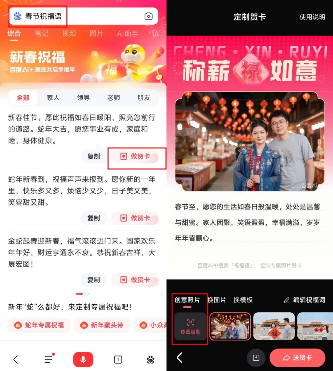 在百度搜索“祝福語”,挑選心儀的AI祝福語點擊“做賀卡”,對提示詞和創意照片進行簡單調整後點擊“生成賀卡”,用户就能獲得一張獨一無二的拜年賀卡。