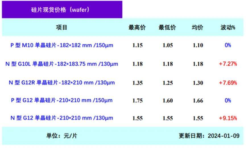 1月第一週,N型G10L單晶硅片成交均價漲至1.18元/片,漲幅達7.27%;N型G12R單晶硅片成交均價漲至1.3元/片,漲幅達7.69%;N型G12單晶硅片成交均價漲至1.55元/片,漲幅達9.15%。