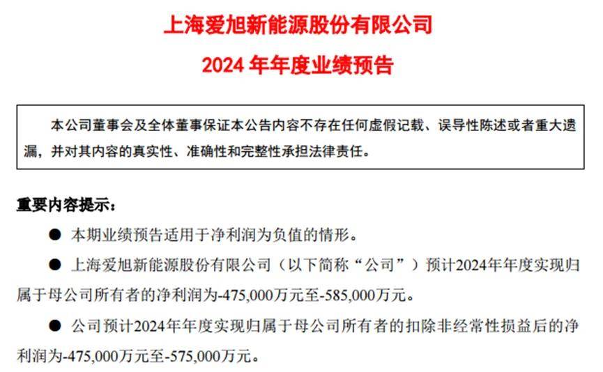 在2024年度報業績預告中,愛旭股份(600732.SH)預計全年實現歸屬於母公司所有者的淨利潤為-47.5億元至-58.5萬元,同比由盈轉虧。