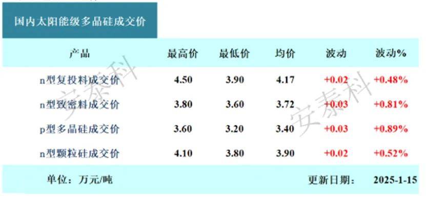 其中,N型復投料成交均價為4.17萬元/噸,環比上漲0.48%;N型顆粒硅成交均價為3.90萬元/噸,環比上漲0.52%。而在1月的第一週,多晶硅價格更是上漲2%。