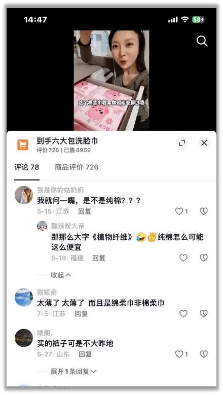 比如她賣的洗臉巾,明明是非純棉的“綿柔巾”,卻被她説成質量更好的“棉柔巾”。
