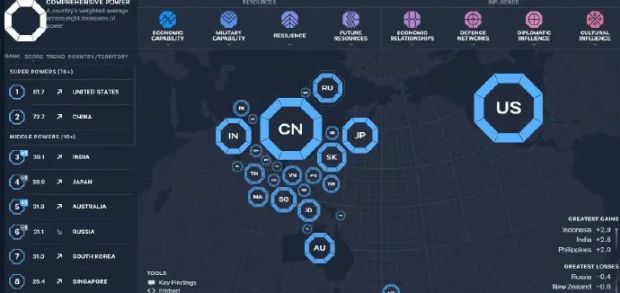 ▲2024年10月,澳大利亞智庫洛伊研究所發佈了年度《亞洲力量指數報告》,報告從經濟、軍事、外交等八個領域評估了27個國家和地區的相對實力,美國和中國分別得分81.7和72.7,位列第一和第二。
