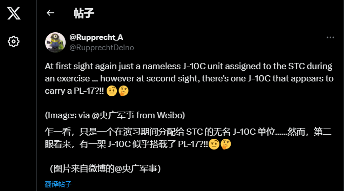報道認為,對於殲-10C這樣的中型單發戰鬥機而言,霹靂-17顯然就有些過重了——殲-10C的有效載荷能力相對有限,這使得它與霹靂-17的組合“有些出乎意料”。特別是殲-10C在中國空軍中的傳統定位為爭奪制空權和對地攻擊,而不是攜帶超遠程空對空武器執行遠程精確獵殺。