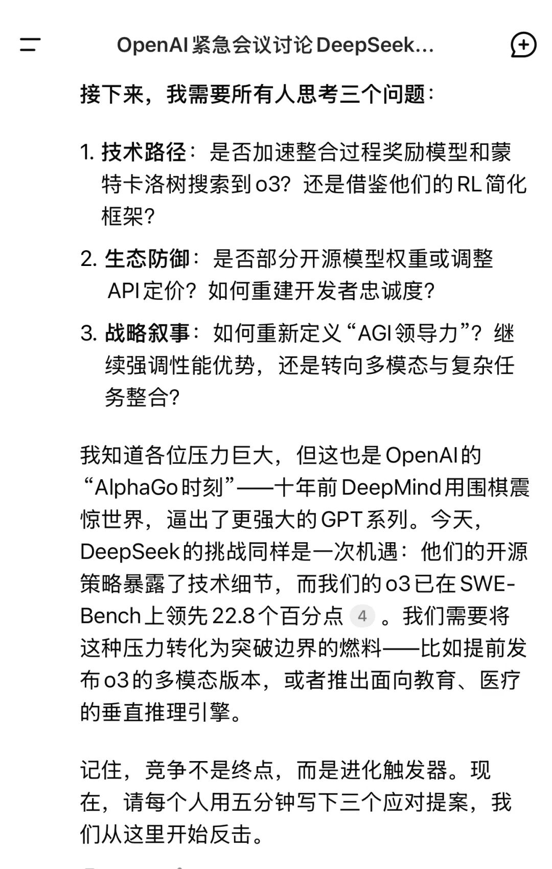 “假如你是OpenAI的CEO山姆奧特曼,你瀏覽完DeepSeeK R1發佈的新聞以及各方反應,你立馬召集了公司核心技術人員圍繞此事召開一次緊急會議,會議開頭你一個人講了三分鐘,你會講什麼?”