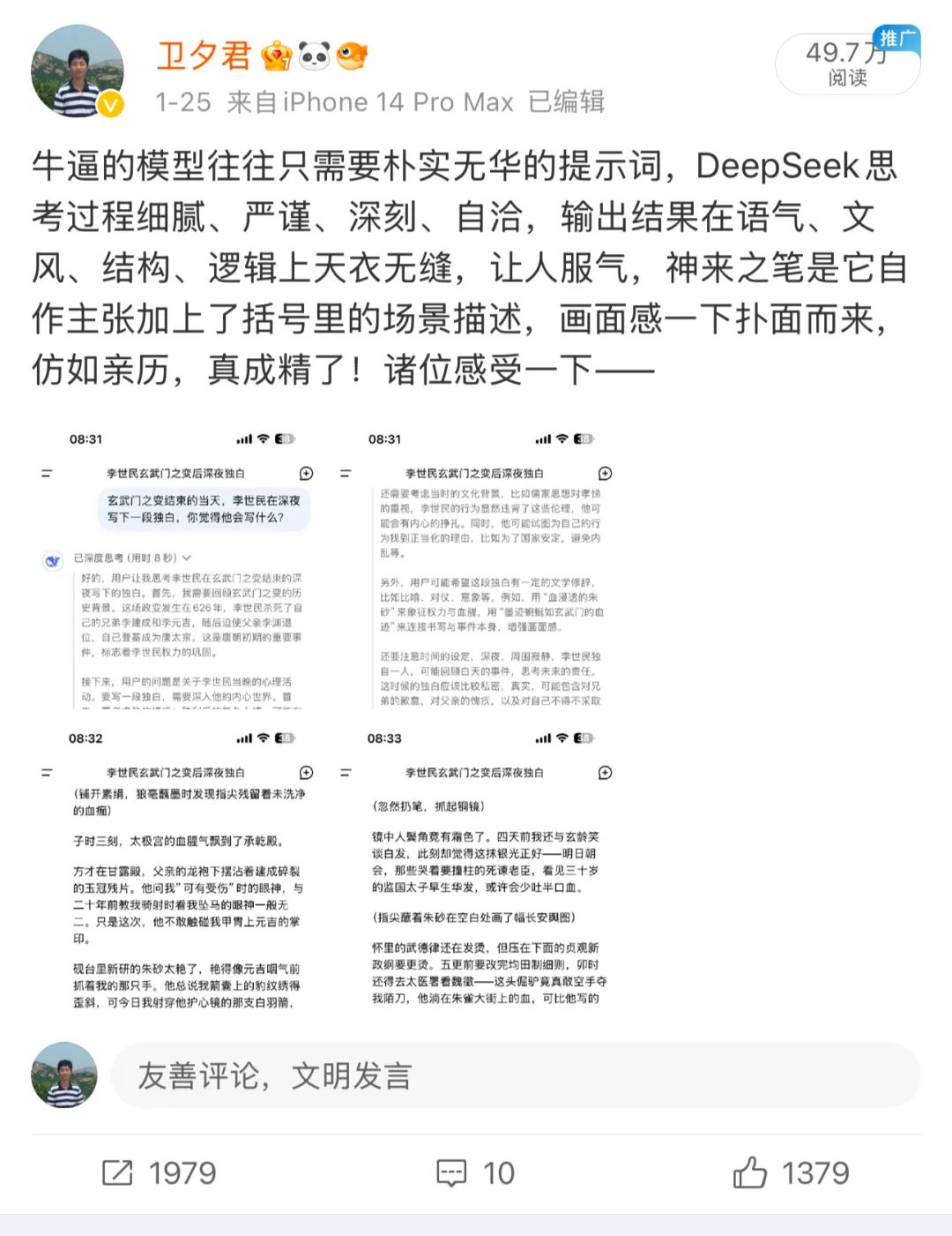 這句評論之所以單獨拿出來説,是因為能想到“隱藏提示詞”的用户,其實已經是AI的高級用户了,而這樣的用户也不相信這是AI直接寫出來的,這從一個側面説明了DeepSeek強大的實力。