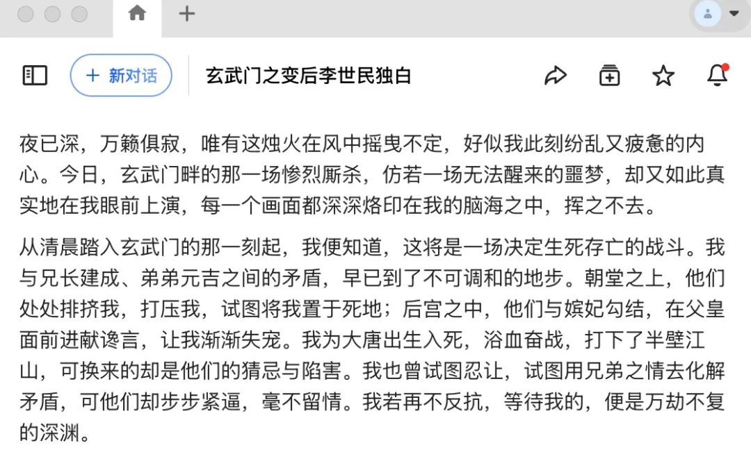 李世民作為千古一君,絕不可能用上面四家輸出結果那樣傻的語氣説話,而DeepSeek也並沒有用力過猛,用相對古典的文字但並沒有直接用文言文,體貼地兼顧了可讀性。