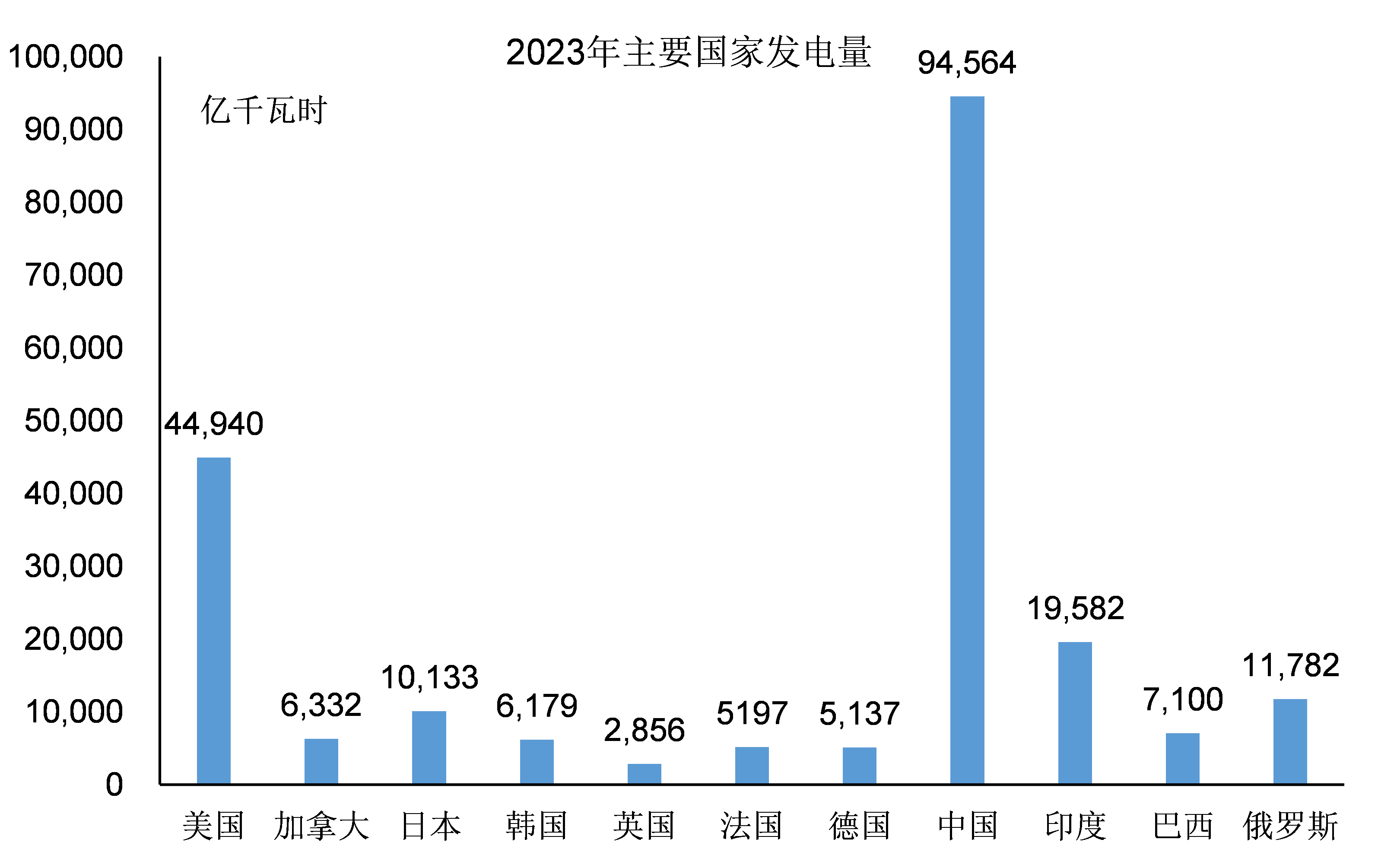 中國是世界發電量最多的國家,達到9.5萬億千瓦時,也是斷崖式領先於其它國家。