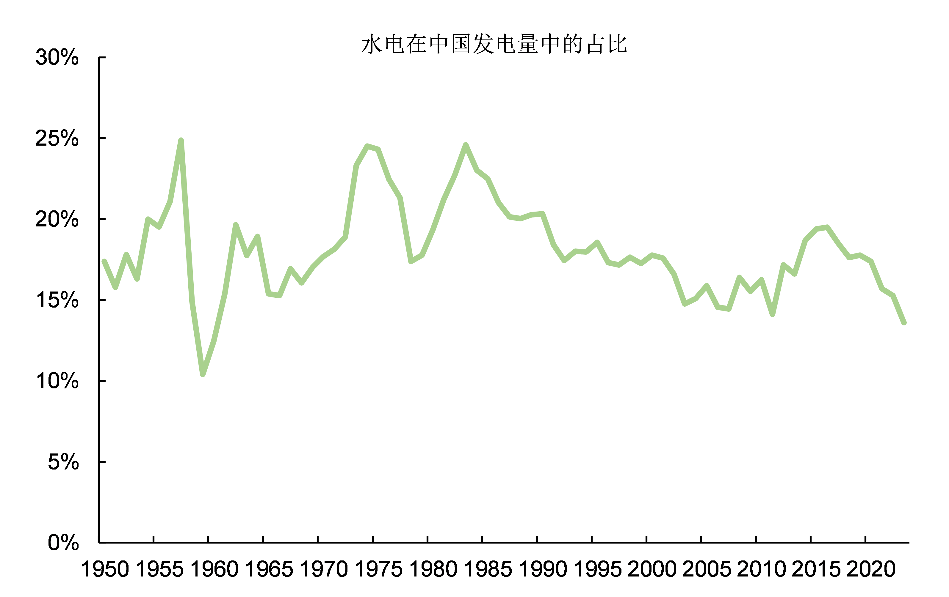 在中國電力工業中,水電的重要性排在火電之後位居第二,水電在中國發電量中的佔比基本維持在20%左右。