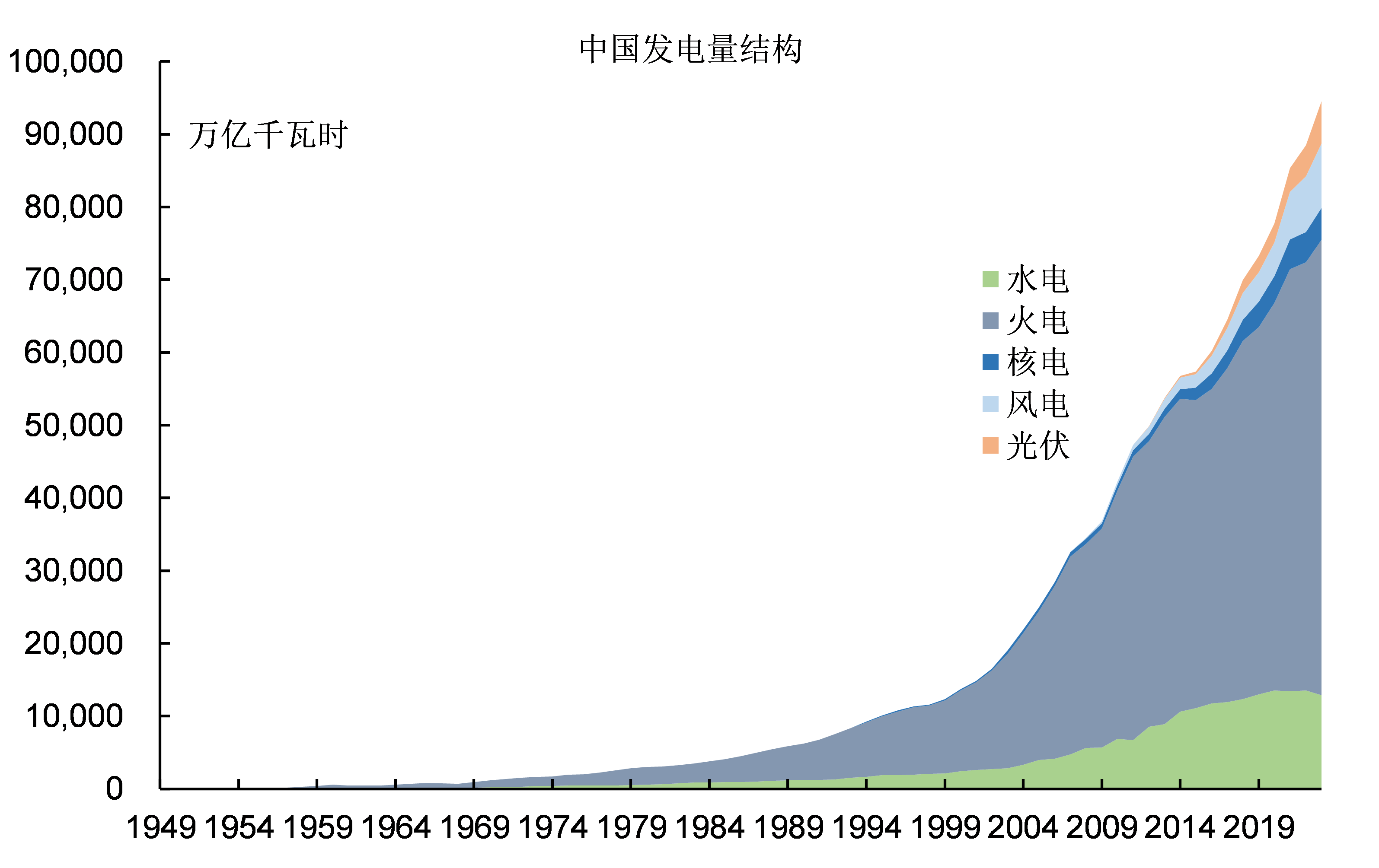 2010年後,隨着水電、核電和風電、光伏發電量的快速增長,火力發電量增量在中國總髮電量增量中的佔比才開始下跌,但是仍然維持在50%以上的水平。