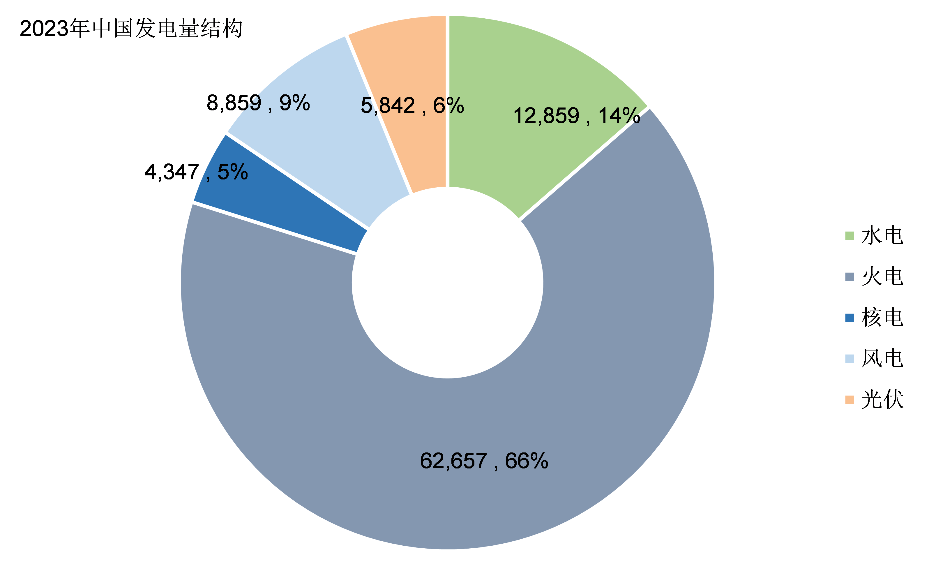 從2012年開始雖然火電的佔比開始下降,但仍然佔據了中國發電三分之二的份額,2023年在中國總髮電量中的佔比是66.3%。