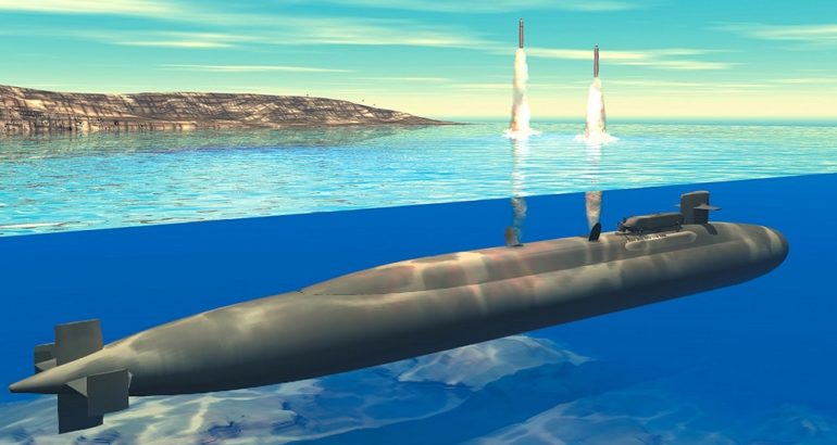 俄亥俄級SSGN發射戰斧陸地攻擊導彈的藝術概念圖。美國海軍圖片。