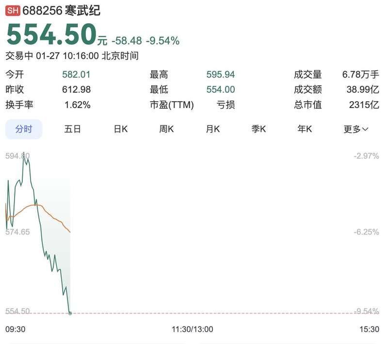 1月27日週一,DeepSeek衝擊全球算力,A股寒武紀大跌,日本半導體股下挫,美股納指期貨領跌。截至發稿,寒武紀持續走低跌近10%,成交額超39億元。