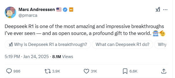 然而,一些西方科技領袖對DeepSeek的崛起表達了積極的看法。Netscape瀏覽器聯合創始人、著名風險投資公司Andreessen Horowitz(a16z)的普通合夥人馬克·安德森發帖稱:“DeepSeek R1是我見過的最令人驚歎和印象深刻的突破之一——作為開源,它是送給世界的巨大禮物!”