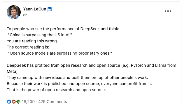MetaAI研究部門FAIR首席科學家楊立昆也稱:“對於那些看到DeepSeek表現後認為:‘中國在AI上超過了美國’的人:你們的解讀錯了。正確的理解是:‘開源模型超過了專有模型。’DeepSeek受益於開放研究和開源(例如Meta的PyTorch和Llama)。他們提出了新的想法,並在其他人工作的基礎上構建。由於他們的工作是公開的,所有人都可以從中受益。這就是開放研究和開源的力量。”