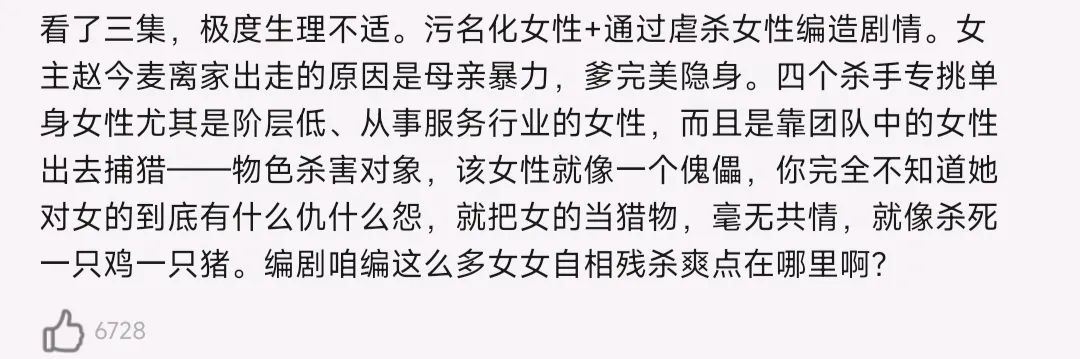 女主被綁匪用工具毆打,身上佈滿血淋淋傷痕的“虐女”情節,也超出了不少觀眾的心理承受範圍。