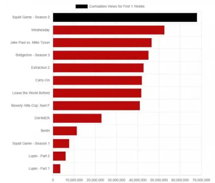 Netflix的用户數暴漲自然離不開多個爆款的連番驅動。去年12月,備受關注的《魷魚遊戲》第二季在Netflix正式上線,首周便吸引了6800萬名用户觀看,播放時間更達到4.876億小時,輕鬆問鼎全球非英語劇集頭名。接下來《魷魚遊戲》第二季完成榜單四連冠,累計觀看量提升至1.657億,總播放時間則錄得11.878億小時,成為Netflix第二成功的非英語劇集,僅次於破22億小時的《魷魚遊戲》第一季。