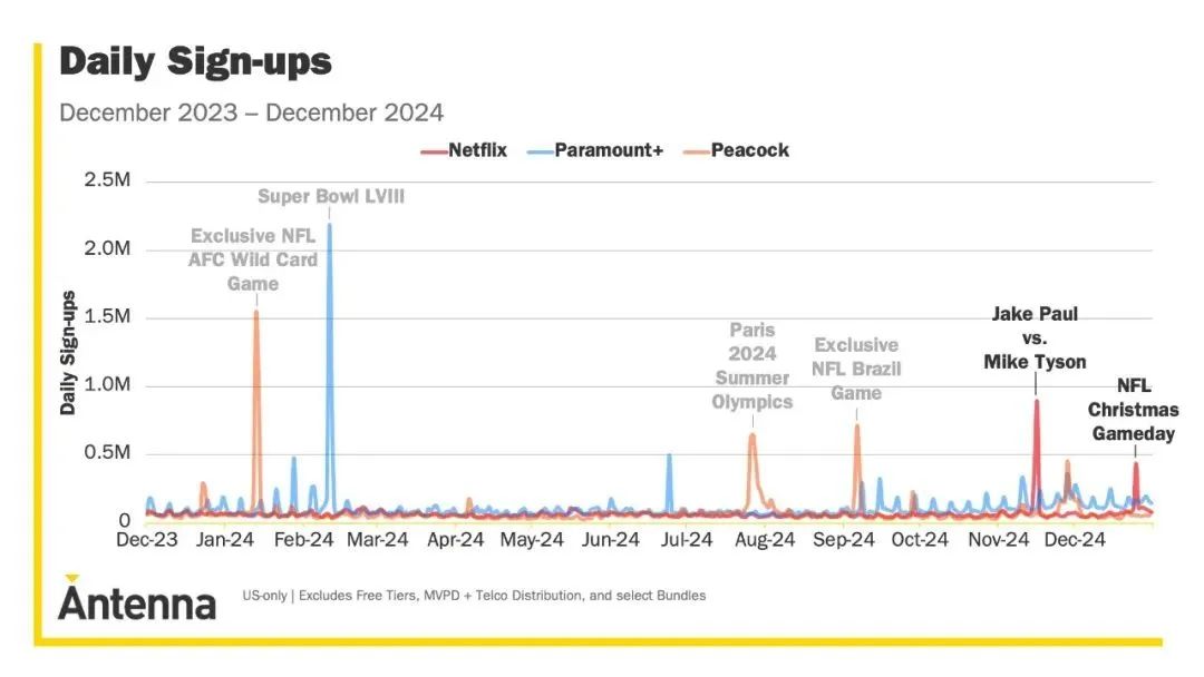 Netflix還在加碼對體育直播節目的投資力度,並在第四季度收穫豐厚的回報。11月16日,傑克·保羅與邁克·泰森的拳擊比賽率先在Netflix登場,從開場到收場的全球平均每分鐘觀眾人數(AMA)達到1.08億,成為歷史上即時觀看量最高的體育賽事。來到12月,Netflix接力直播美國職業橄欖球大聯盟(NFL)的兩場聖誕日賽事,雙雙錄得超過3千萬的全球AMA,同樣創下NFL比賽的觀看紀錄。再加上名為“碧昂絲碗”(Beyoncé Bowl)的中場秀,聖誕節NFL比賽的全球社交媒體互動數超過10億次。有鑑於此,Netflix宣佈已獲得2027年和2031年國際足聯女足世界盃的美國轉播權,以期進一步發掘體育直播的富礦。