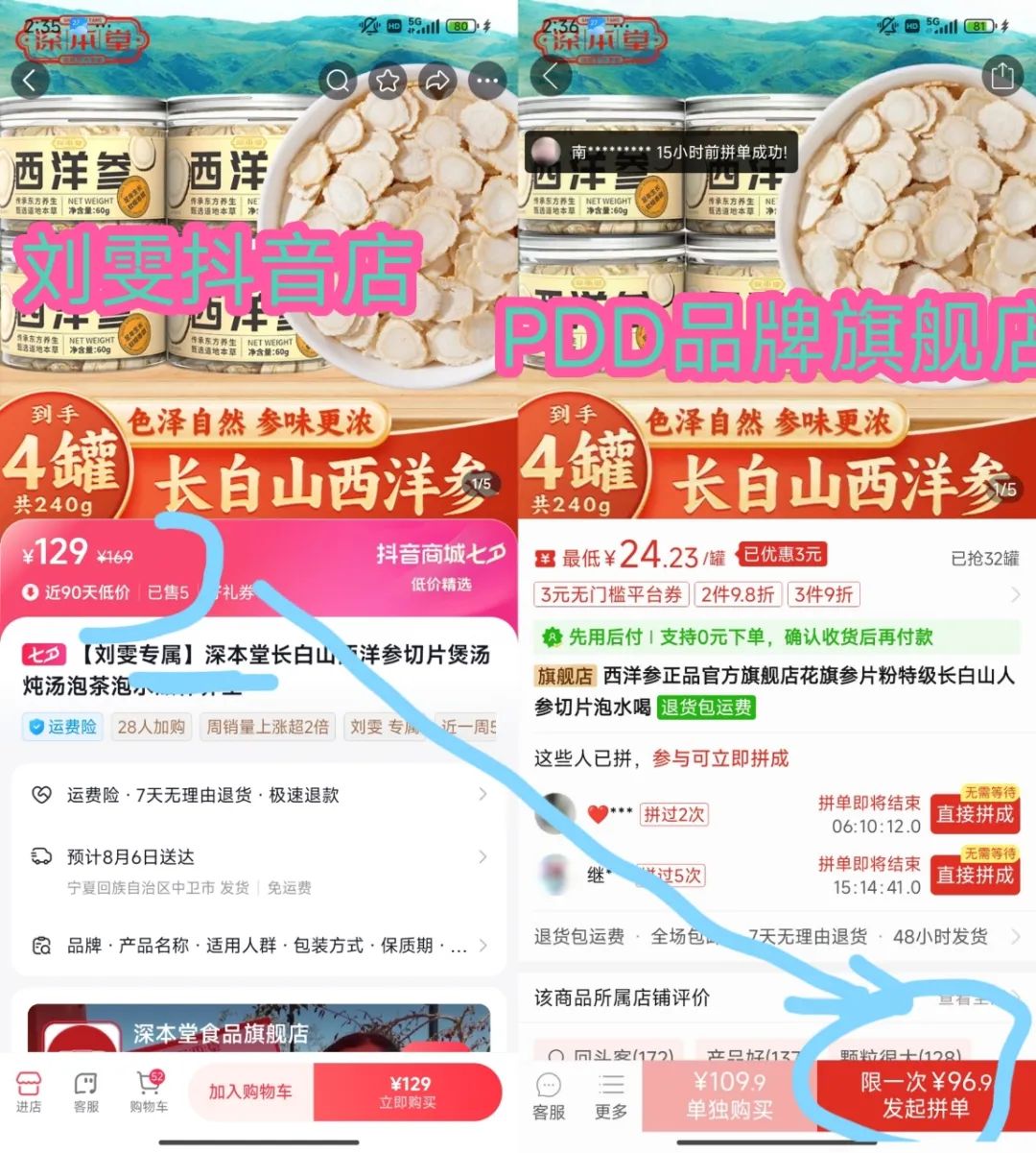 劉雯在抖音網店售賣比拼多多同款貴出33%的西洋參