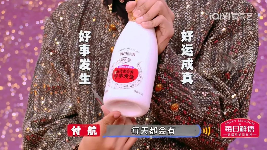 一方面,如上文所説,每日鮮語被付航巧妙地融入到段子裏,內容互文品牌價值,“還有家人一起喝的幸福感”充分符合品牌方CNY營銷所要傳遞的核心理念;另一方面,付航在節目中通過撕開包裝獲得品牌新年祝福的方式,讓喜氣氛圍與頗具盲盒感的驚喜感得以深化,特別是付航作為觀眾票選的“鮮”開好運官,掀開的每日鮮語的標籤上寫着“每天都有好事發生”,完全符合每日鮮語“好鮮奶「鮮」開好運”的CNY營銷主題。