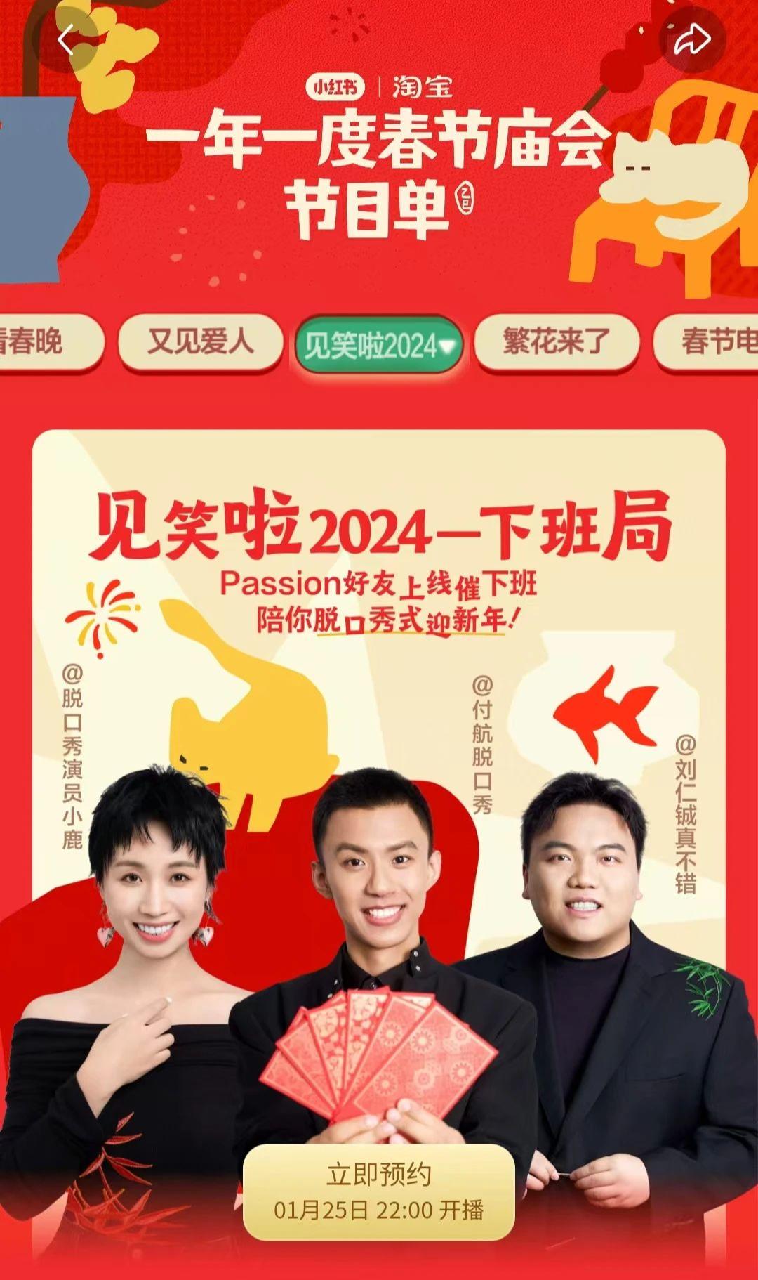 例如,節目與度小滿聯動,搭建並落地度小滿APP內運營活動《笑料不停,好禮頻頻》活動,用户參與互動可以獲得財運值,活動期間用户根據財運值排名獲得黃金藏品、加油卡等獎品;小紅書也推出帶話題做任務、得積分、每日抽獎等活動,邀請三位演員推出《見笑啦2024》直播……在晚會內容運營的基礎上,平台方與品牌方聯手共創、下場搭建“第二聲量場”,無疑讓意猶未盡的用户找到更多歸宿感,讓笑點再飛一會兒,也讓用户的情緒價值多滿足一會兒,從而延續IP營銷的長尾價值。