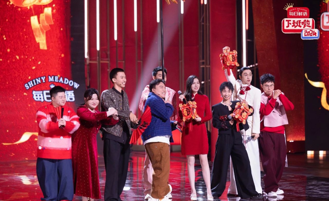 以每日鮮語為例,其不光獨家冠名了晚會,還簽下了核心演員付航作為“鮮”開好運官,並拍攝了創意廣告。從場景植入、內容創意再到主咖藝人借勢,《下班啦2024》配合品牌方CNY營銷重點,打出了強有力的組合拳。