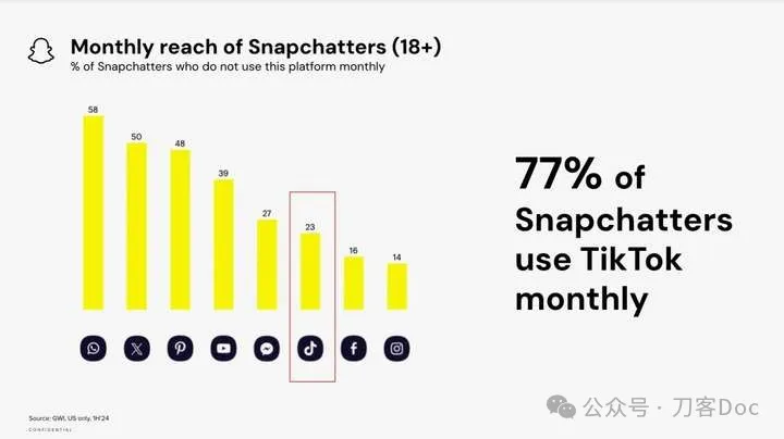 Snapchat稱60%的18歲以上美國用户,每天都在使用TikTok,77%的Snapchat美國成年用户每月都會使用TikTok。任何尋求潛在替代品的人至少可以在Snapchat上找到大多數TikTok用户。