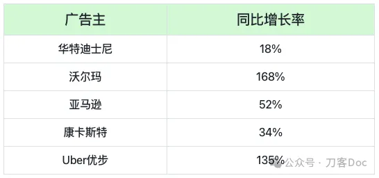 行業研究機構MediaRadar有一份數據印證了這一點。2024年美國廣告主在TikTok上花費比2023年,同比增長27%。尤其是24年底,品牌主在TikTok上的廣告支出猛增,11月同比增長45%,12月同比增長77%。TikTok上排名前5的廣告商,每個廣告主至少花費4500萬美元。