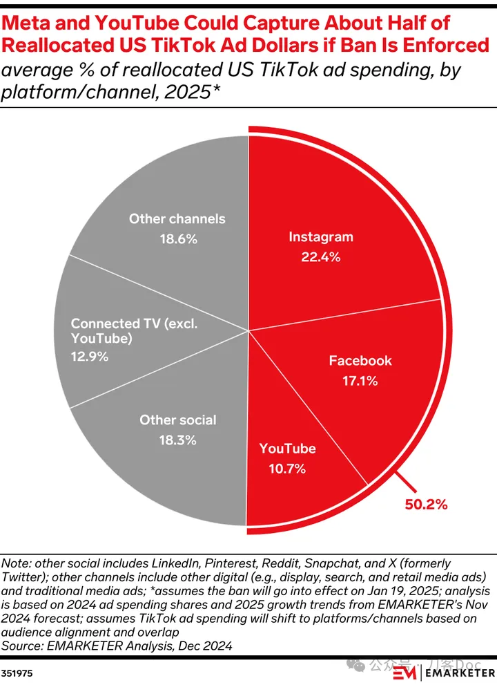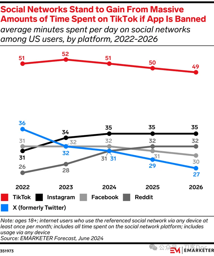 2024年,TikTok用户每天在TikTok上花費的時間(51分鐘),Instagram只有35分鐘。但兩者用户的重合比高達75%。如果TikTok退出,大量的使用時間將流向Instagram。