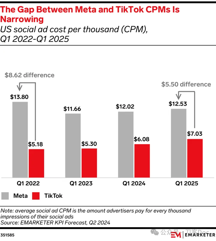 這映射到TikTok上,其美國廣告業務呈現出了一個顯著的特點:大品牌繼續加碼投放,不少的中小商家選擇暫停觀望。對很多大型品牌廣告主而言,TikTok一直都是流量的窪地。2022年Q1-2024年Q1,TikTok的CPM價格一直不及Meta的一半,在今年預計將CPM的差價縮小到5.5美元。