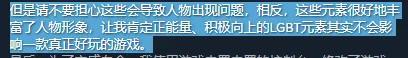 不過,角色之間的關係,摻雜了一些LGBTQ的元素,姬除了被製作組“開門見喜”還沒有玩到別的LGBTQ元素。但是從評論區和網友們的反應來看,這些元素似乎並不影響這款遊戲的劇情發展,反倒豐富了人物的性格。