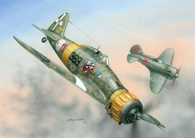 關於M.C. 200與I-16的空戰幻想圖。實際上,這樣的空戰是不可能發生的,因為當I-16在西班牙積極參戰時,“雷電”還沒有投入使用。而在東線,意大利戰鬥機面對的是另一代戰機。