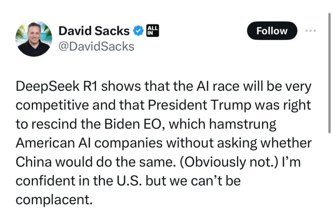 如今的美國,正計劃大舉砸錢投入AI基礎設施。就在上週,美國新任總統特朗普宣佈OpenAI、甲骨文、軟銀將成立一家合資企業“星際之門項目”,未來四年斥資5000億美元(約合人民幣3.6萬億元)建設新的AI數據中心。特朗普的人工智能“沙皇”薩克斯表示,DeepSeek“表明人工智能競賽將非常具有競爭力,美國人能自信但不能自滿。