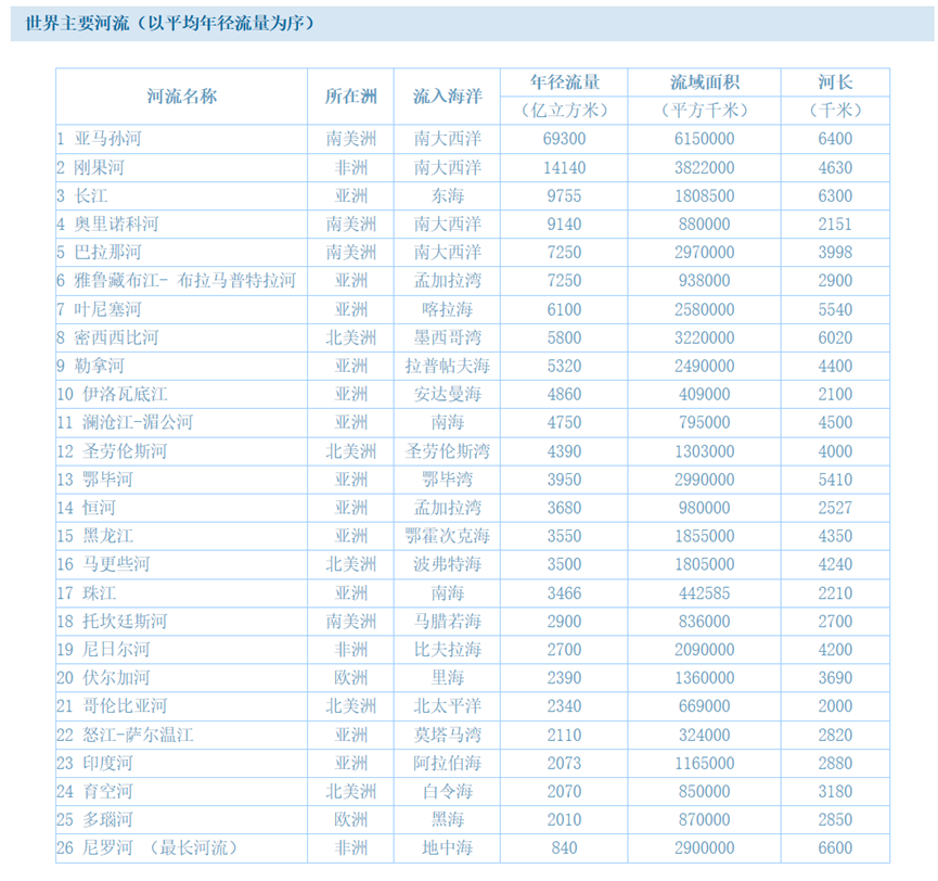 中國科學院搞的科普網站中國科普博覽上有全球河流的徑流量排名,https://www.kepu.net.cn/vmuseum/earth/geography/zrys/zrys03_01_02.html